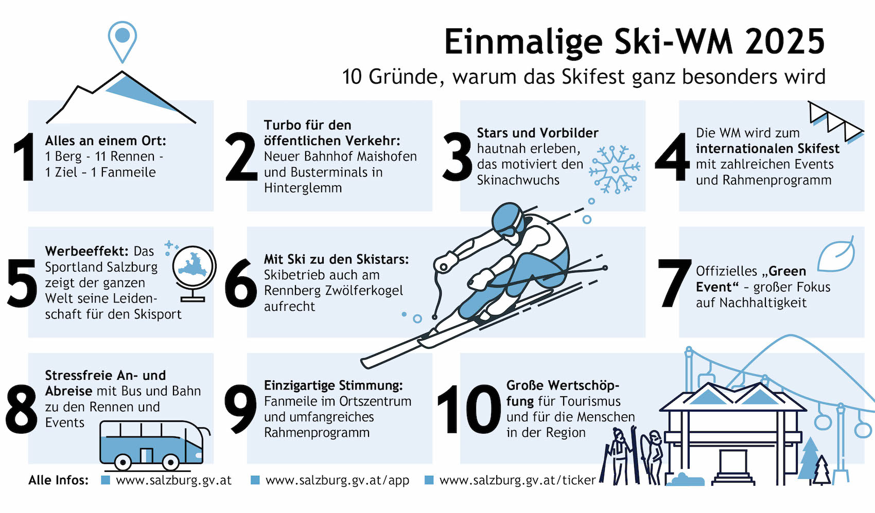 Am 4. Februar 2025, fällt in Saalbach-Hinterglemm mit der Eröffnungsfeier und dem ersten Bewerb der Startschuss für die Alpine Ski-Weltmeisterschaft 2025. Elf Mal werden Gold, Silber und Bronze vergeben, doch ein großer Gewinner steht bereits jetzt fest: Das SalzburgerLand.