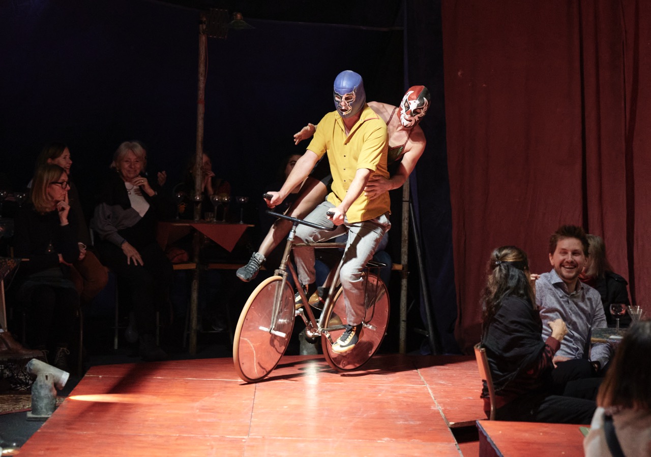 Tags darauf, am 27. November, lud La Faux Populaire in “Le Cabaret Renversé”. Julien und Juliette spielten mit alten Klischees der Mann-Frau-Beziehung. Ist die Frau sinnlich, sanft und fröhlich, der Mann mutig, agil und muskulös? Im charmanten Compagniezelt an kleinen runden Tischen erlebte man ein bizarres akrobatisches Kabarett, berührend und gleichzeitig sehr, sehr witzig.